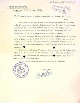 Carta de Josep Brú Mons al president del Centre de Lectura