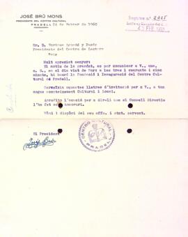Josep Bru Mons, president del Centre Cultural del Pradell, convida al president del Centre de Lectura a la inauguració de l'entitat. Data del document: 24-02-1960