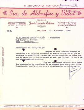 Josep Casasús Colom, propietari d'Establecimientos Hortícolas Suc. de Aldrufeu y Vidal, agraeix al Centre de Lectura l'obsequi de la fotografia del Jurat del Concurs Exposició Nacional de Roses d'aquest any. Data del document: 10-11-1960