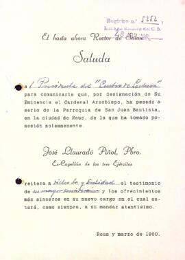 Josep Llauradó Piñol informa al president del Centre de Lectura del seu nou càrrec com a Rector de la Parròquia de Sant Joan Baptista de Reus. Data del document: març 1960