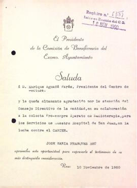 Josep M. Franquès Bru, president de la Comisión de Beneficencia, agraeix la col·laboració del Centre de Lectura en la campanya Pro-compra Aparell de Radioteràpia per a l'Hospital Sant Joan de Reus. Data del document: 10-11-1960