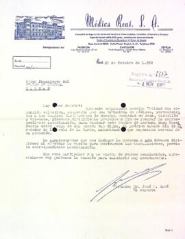 José P. Savé, gerent de Médica Reus, S.A., demana autorització per a una visita en grup al Centre de Lectura el 29 d'octubre. Data del document: 20-10-1960