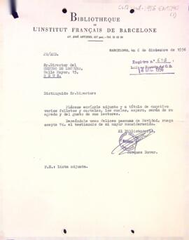 Carta de la Bibliotheque de l'Institut Français de Barcelone al director de la biblioteca