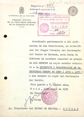 Carta de la Cambra de la Propietat Urbana de Reus de la Comarca al president del Centre de Lectura