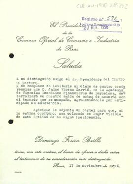 Invitació de la Cambra Oficial de Comerç de Reus al president del Centre de Lectura