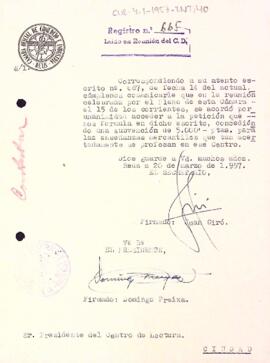 La Cambra de Comerç i Indústria de Reus concedeix una subvenció de 5.000 pessetes al Centre de Lectura per als estudis mercantils de l'entitat. Data del document: 20-03-1957