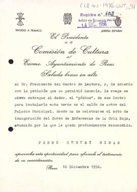 Carta de la comissió de cultura de l'Ajuntament de Reus al president del Centre de Lectura