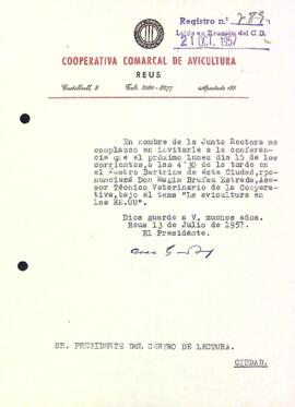 La Cooperativa Comarcal de Avicultura de Reus convida al president del Centre de Lectura a la conferència de Magí Brufau Estrada, "La avicultura en los EE.UU". Data del document: 13-07-1957