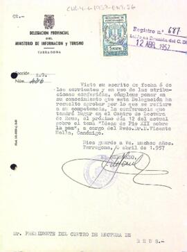 La delegació provincial del Ministeri d'Informació i Turisme dóna la seva aprovació per a la conferència de Vicente Nolla, amb el títol "Ideas de Pío XII sobre la paz", que s'ha de celebrar el 12 d'abril al Centre de Lectura. Data del document: 08-04-1957