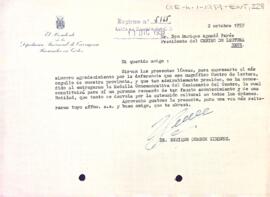 Carta d'agraïment de la diputació de Tarragona a president del Centre de Lectura