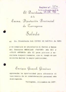 Enric Guasch Giménez, president de la Diputació provincial de Tarragona, adjunta el cartell i les bases del concurs Medallas Tapiró Año XII y Julio Antonio Año XI de pintura i escultura. Data del document: Desembre 1957