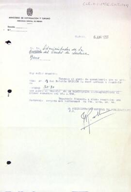 Carta de la direcció general de premsa al Centre de Lectura comunicant l'enviament del Boletín Opinión