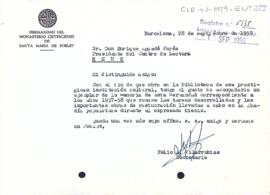 Felio A. Vilarrubias informa Enric Aguadé del donatiu d'un exemplar de la memòria de la germandat dels anys 1957-1958.