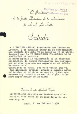 El president de la junta directiva de l'associació comunica a Enric Aguadé la celebració de la I Exposició Filatèlica que es durà a terme a l'entitat que presideix, de la qual li envia reglaments per si els volen exposar.