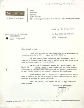 La revista Constellation comunica a Francesc Font de Rubinat que per continuar rebent la publicació haurien de renovar la subscripció, tot informant les condicions d'aquesta.
