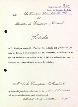 Mª de la Concepción Mendicuti, en absència del Ministre de eduación Nacional, agraeix l'obsequi d'un exemplar de la Revista del Centre de Lectura. Data del document: 29-10-1957