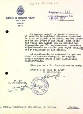 La Societat de Caçadors Diana demana al Centre de Lectura un trofeu per als concursos de tir que volen organitzar per les festes de Sant Pere i Sant Jaume. Data del document: 02-05-1957