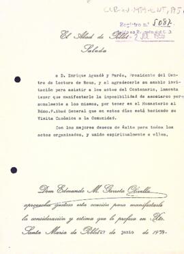 Edmon M. lamenta comunicar a Enric Aguadé la impossibilitat d'assistir als actes de celebració del centenari de l'entitat per tenir la visita de l'Abat general.