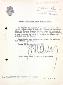 Joan-Amado Albouy sol·licita a Enric Aguadé la secció de la sala d'exposicions per celebrar l'exposició del X Concurs Fotogràfic de Setmana Santa.