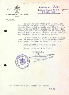 L'alcalde de Reus comunica al Centre de Lectura, la concessió d'un trofeu per al II Concurso Nacional de Fotografías de Rosas. Data del document: 23-05-1957