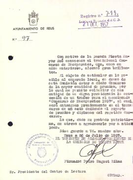 Pere Huguet Ribas, tinent d'alcalde de Reus, demana al Centre de Lectura un trofeu per al Concurs d'aparadors de 1957, amb motiu de la Festa Major. Data del document: 26-07-1957