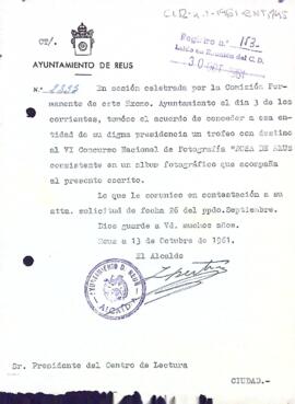 Carta de l'alcalde de Reus al president del Centre de Lectura