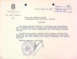 L'Alcalde de Sant Feliu de Llobregat felicita a Enric Aguadé Parés per la seva reelecció com a president del Centre de Lectura. Data del document: 27-06-1957