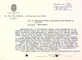 L’Ajuntament de Sant Feliu de Llobregat felicita el senyor Enric Aguadé Parés per la seva reelecció com a president del Centre de Lectura de Reus. Data del document: 26 de juliol de 1957.