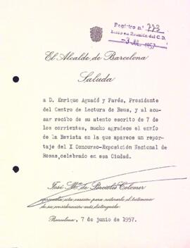 Josep M. de Porcioles Colomer, alcalde Barcelona, agraeix al Centre de Lectura l'exemplar de la Revista del Centre de Lectura de Reus que inclou un article sobre el X Concurs Exposició Nacional de Roses. Data del document: 07-06-1957