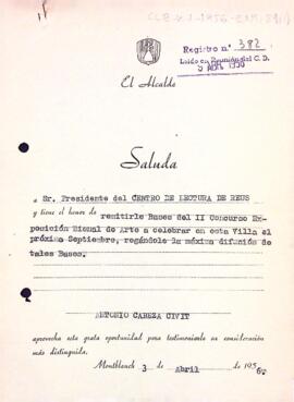 Antonio Cabaza comunica l'enviament de les bases del II Concurs-exposició biennal d'art que se celebrarà al setembre.
