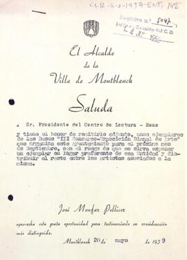 Carta de l'alcalde de Montblanc al president del Centre de Lectura