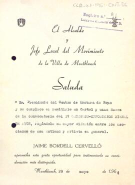 Jaume Bordell comunica a Enric Aguadé l'enviament del cartell i les bases de la convocatòria del IV Concurs-exposició biennal d'art.
