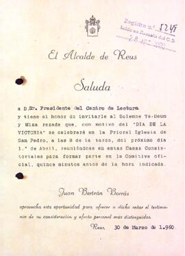 Joan Bertran Borràs, alcalde de Reus, convida la president del Centre de Lectura al Te-Deum i missa resada, amb motiu del Dia de la Victòria. Data del document: 30-03-1960