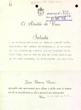 Joan Bertran Borràs, alcalde de Reus, adjunta una carta rebuda a l'Ajuntament de José Olmo Boullón, que demana informació i fotografies sobre el Concurs Exposició de Roses. Data del document: 03-05-1957