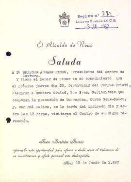 Joan Bertran Borràs, alcalde de Reus, informa que el dia de Corpus visitaran el Centre de Lectura els periodistes de la Promoció de Tarragona, Curs Reus-Salou. Data del document: 18-06-1957