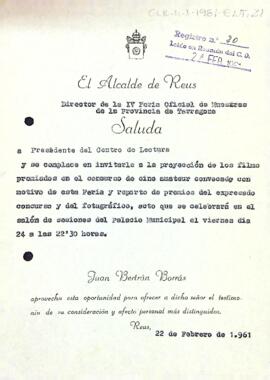 Joan Bertran convida Enric Aguadé a la projecció dels films premiats en el concurs de cine amateur convocats amb motiu de la fira i al repartiment de premis del concurs fotogràfic.