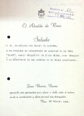 Carta de l'alcalde de Reus al president del Centre de Lectura