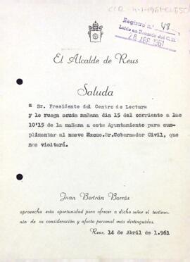 Carta de l'alcalde de Reus al president del Centre de Lectura