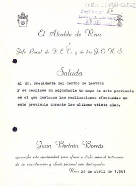 Carta de l'alcalde de Reus al president del Centre de Lectura