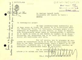 Joan-Amado informa Enric Aguadé, després d'haver conversat amb el rector de la Universitat Laboral Francisco Franco, de la possibilitat d'organitzar un cicle de projecció universitària sobre temes d'investigació al saló d'actes del Centre de Lectura.