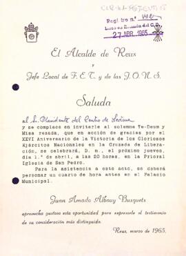 Joan-Amado convida Enric Aguadé al solemne Te-Deum i missa resada en commemoració al XXVI aniversari de la victòria dels exèrcits nacionals.