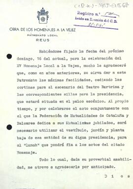 Joan-Amado Albouy sol·licita a Enric Aguadé, com cada any, les cortines del Teatre Bartrina i les cadires de la presidència per a dur a terme l'homenatge. També demana poder ús fer d'algunes dependències de l'entitat.