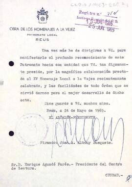 Carta d'agraïment de l'alcalde de Reus al president del Centre de Lectura