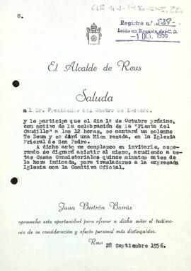 Joan Borràs convida Enric Aguadé a la "Fiesta del Caudillo" en la qual es cantarà el Te Deum i es farà una missa resada a la Prioral de Sant Pere.