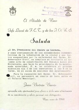 Joan Bertran Borràs, alcalde de Reus, convida al president del Centre de Lectura a l'acte de constitució del Consejo Local del Movimiento. Data del document: gener 1960