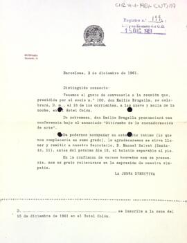 La junta directiva de l'Associació de Bibliòfils convoca Enric Aguadé a la reunió que se celebrarà on Emili Brugalla pronunciarà una conferència.