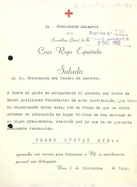 Carta de l'Assamblea local de la Creu Roja Espanyola al president del Centre de Lectura