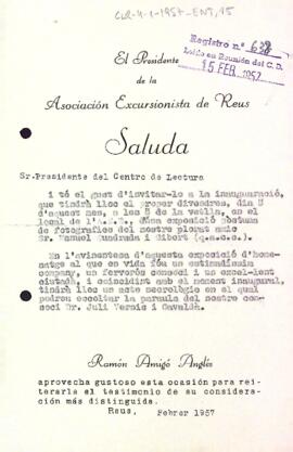 Ramon Amigó Anglés, president de l'Associació Excursionista de Reus convida al president del Centre de Lectura a l'exposició pòstuma de Manuel Quadrada i Gibert i a l'acte necrològic a càrrec de Juli Vernis i Gavaldà. Data del document: Febrer de 1957