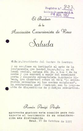 Ramon Amigó Anglés, president de l'Associació Excursionista de Reus, convida al president del Centre de Lectura a la conferència d'Antonio Ribera, "La exploración submarina en las costas catalanas". Data del document: 29-10-1957