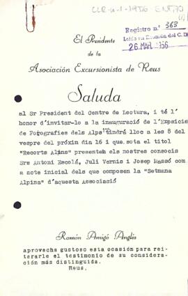 Invitació de l'Associació Excursionista de Reus al president del Centre de Lectura